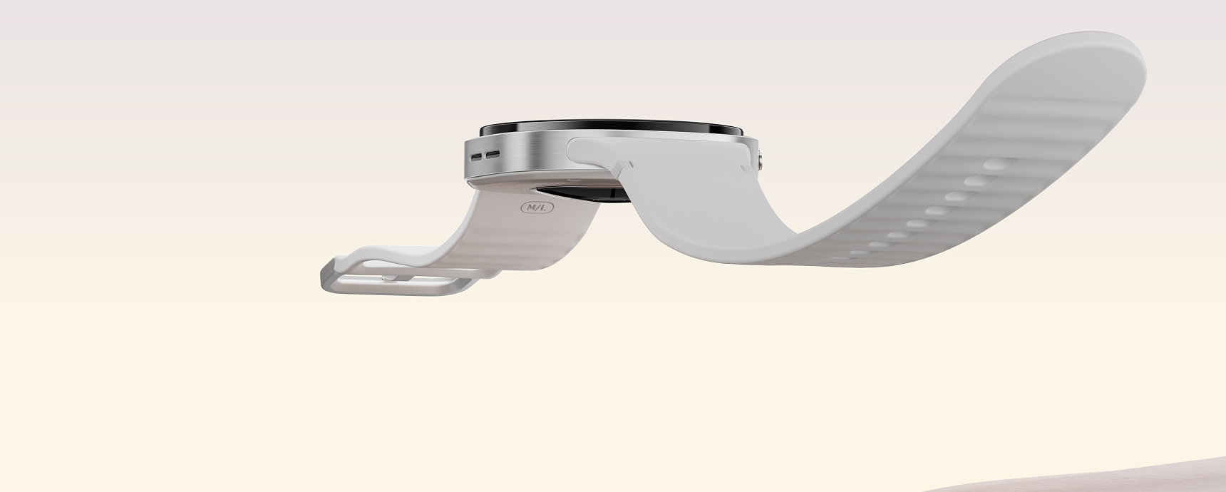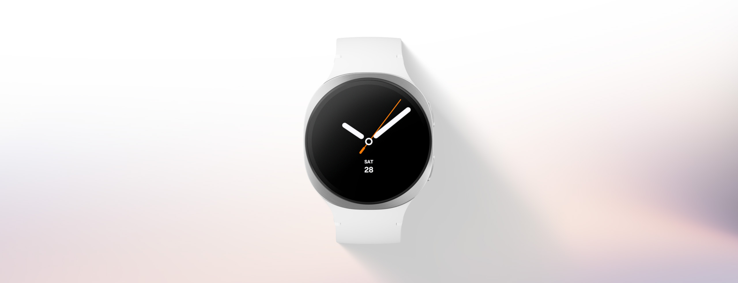 A person's arm extended outward as Galaxy Watch8 with a white Sport Band gently lands and attaches to their wrist.