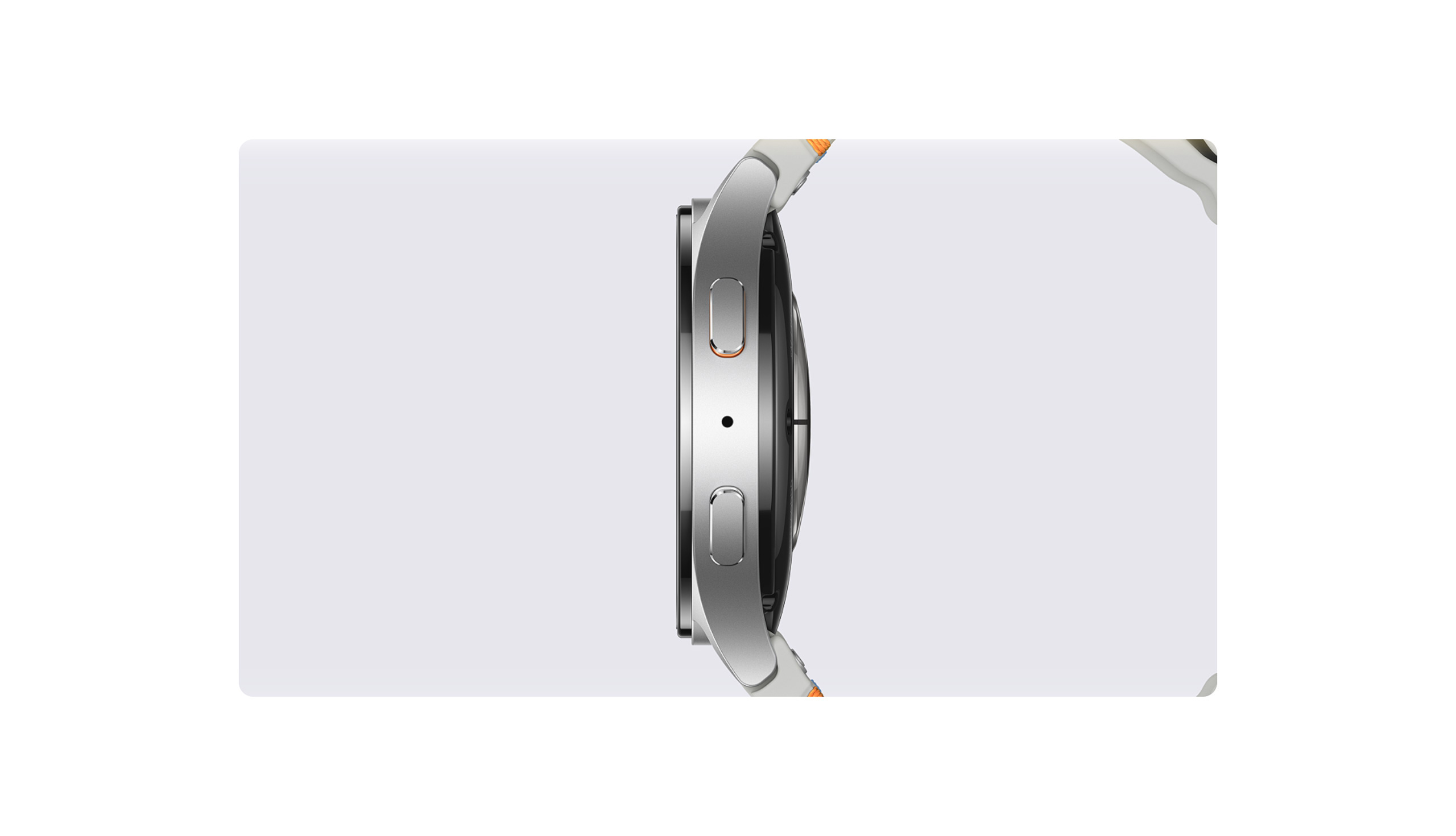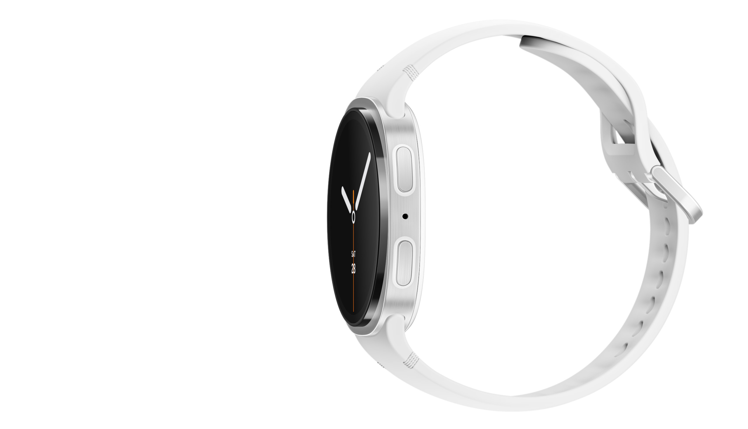 Side view of Galaxy Watch7 then from top-down a side view of Galaxy Watch8 gradually appears comparing the thickness between the 2 smartwatches. When the full side view of Galaxy Watch8 appears, it is shown secured by a white Sport Band, buckled into a loop. Galaxy Watch8 then turns slightly, revealing the watch face.