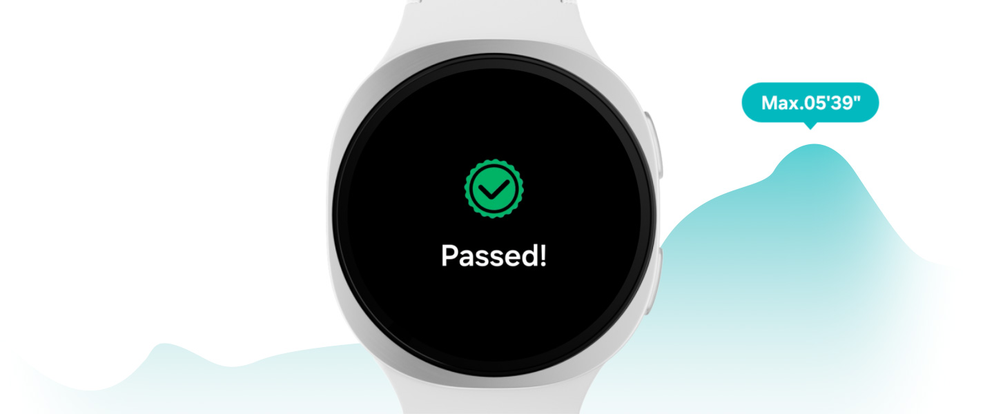 Running Coach screen shown on Galaxy Watch8 with the text 2. Repetitions. 1.80 km, 05'40". Screen changes. Workout 2. Repetitions. 1.80km. 05.40". 22:12. A running pictogram is shown in the background. After the Start button is tapped, the pictogram reaches the finish line, with the screen showing the status. The screen displays a check icon with the text 'Passed!'.