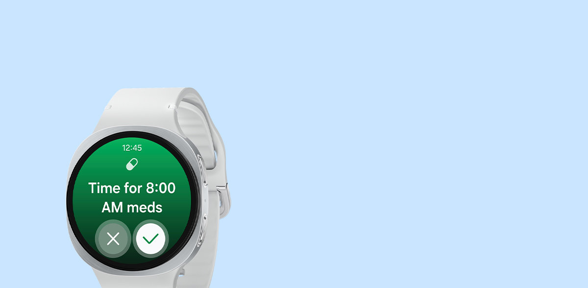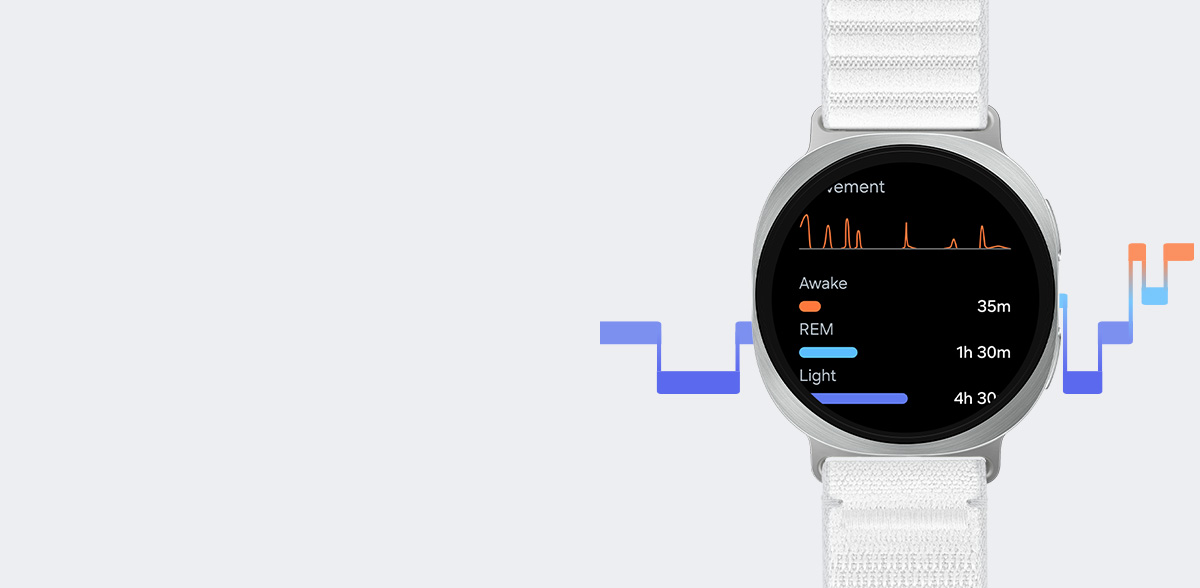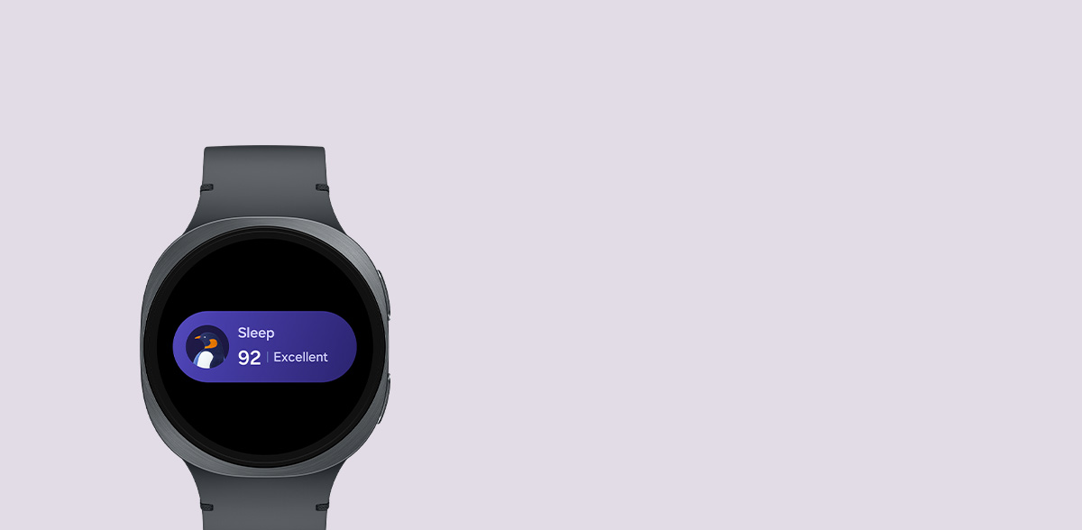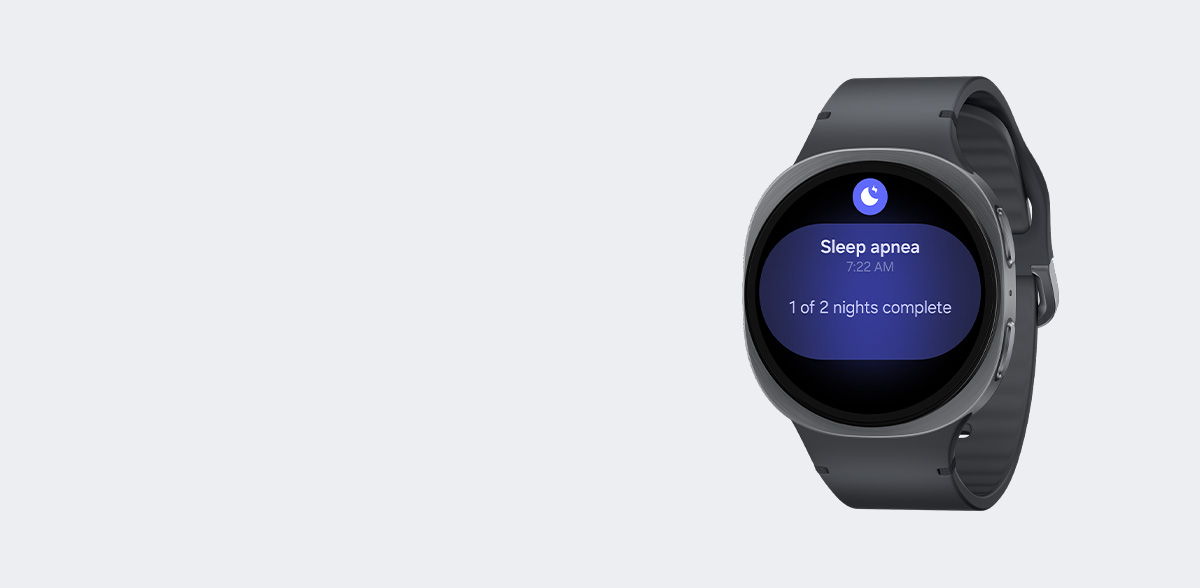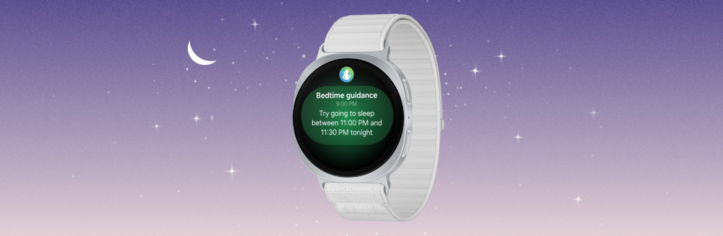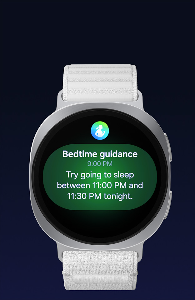 Build good sleep habits with Bedtime Guidance. Galaxy Watch8, with the built-in sleep monitor and tracker, uses three days worth of sleep data to find your optimal bedtime, the first step toward better sleep. Get smart nudges for your ideal bedtime and get the rest you need. Wake up feeling refreshed, fully recharged and better prepared to take on the day — all with a personalized sleep schedule. 2,5