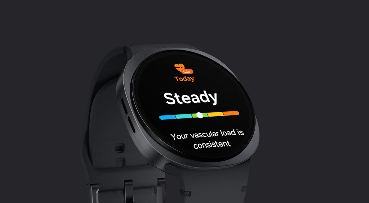 An optical sensor of Galaxy Watch8 measures the Vascular Load. Then Galaxy Watch8 is shown, displaying the texts 'Today' and 'Steady', along with a scale with an indicator. At the bottom is the message 'Your vascular load is consistent'.