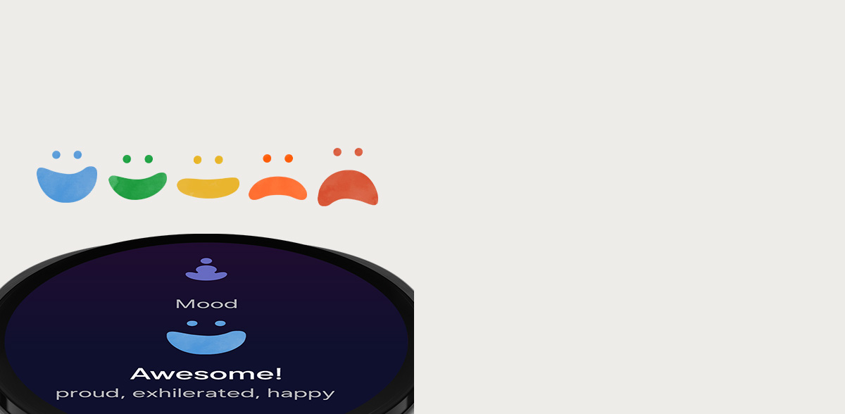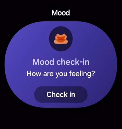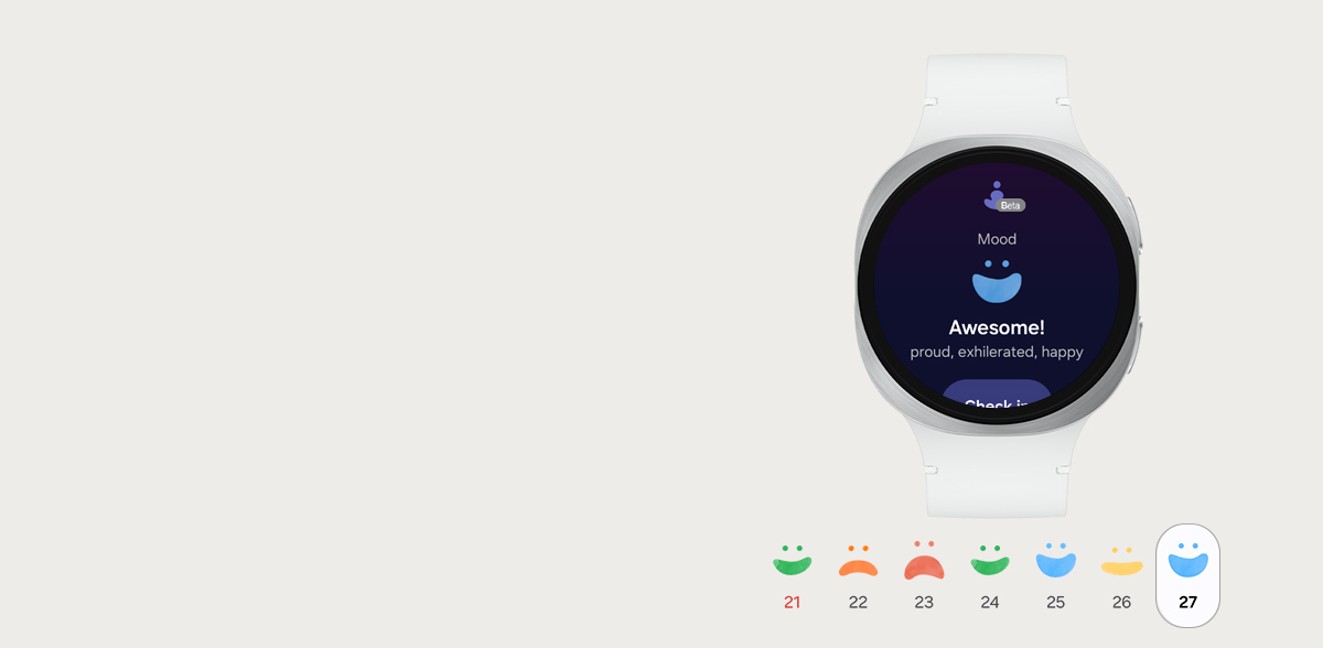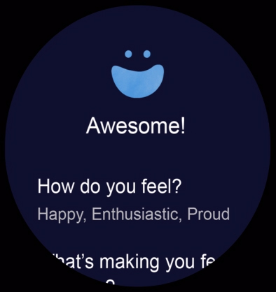 Galaxy Watch8 displaying a Mood check-in notification on screen, with the text 'How are you feeling?'. 'Check in' button below is tapped, 'Awesome' is selected. 'Next' is tapped. The text appears. 'Awesome! How do you feel? Happy, Enthusiastic, Proud.'