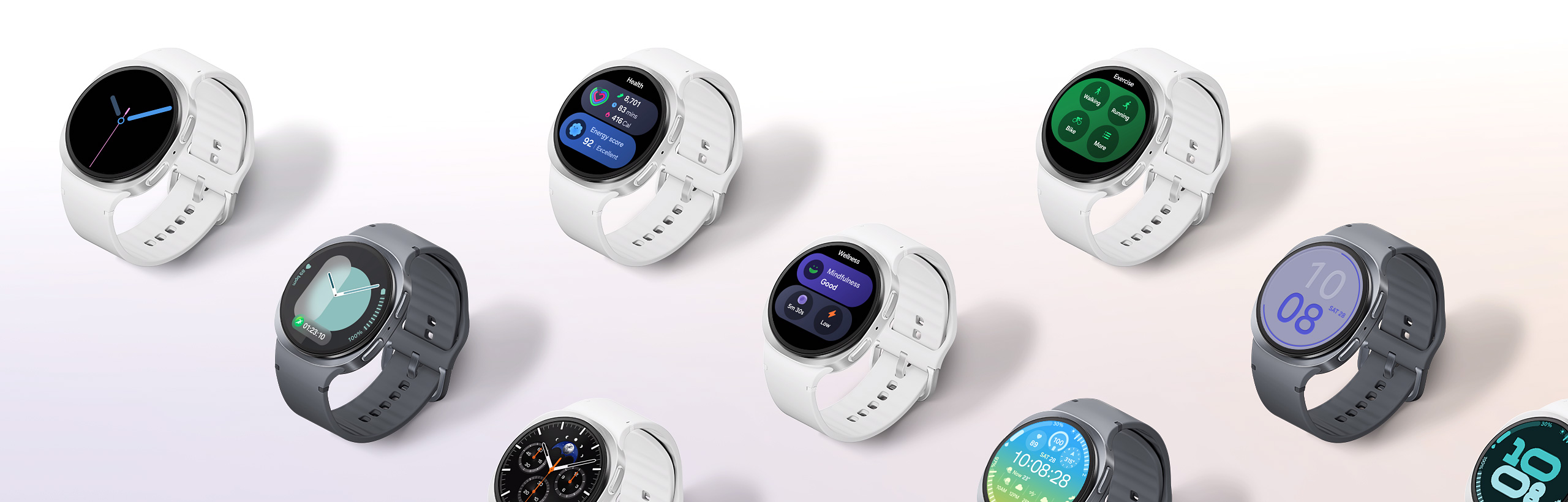Galaxy Watch8 displaying different screens of One UI 8, including Now bar, running, weather, Exercise Tracking and more.
